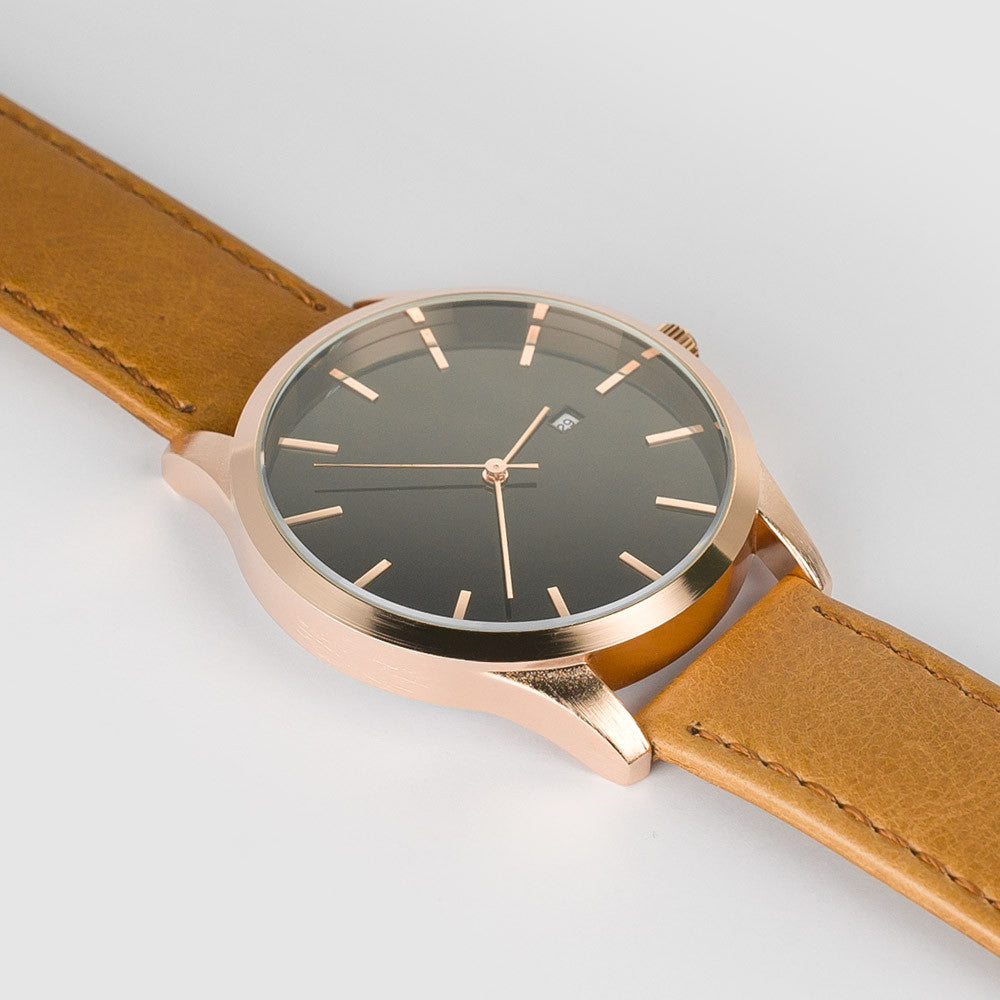 This timepiece has a refined look with flamboyant appeal. It features a classic 44 mm rose gold case, and a clean black dial which set up a simple yet striking statement. Minimalist rose gold hour markings adorn the watch face in what is a truly beautiful design.